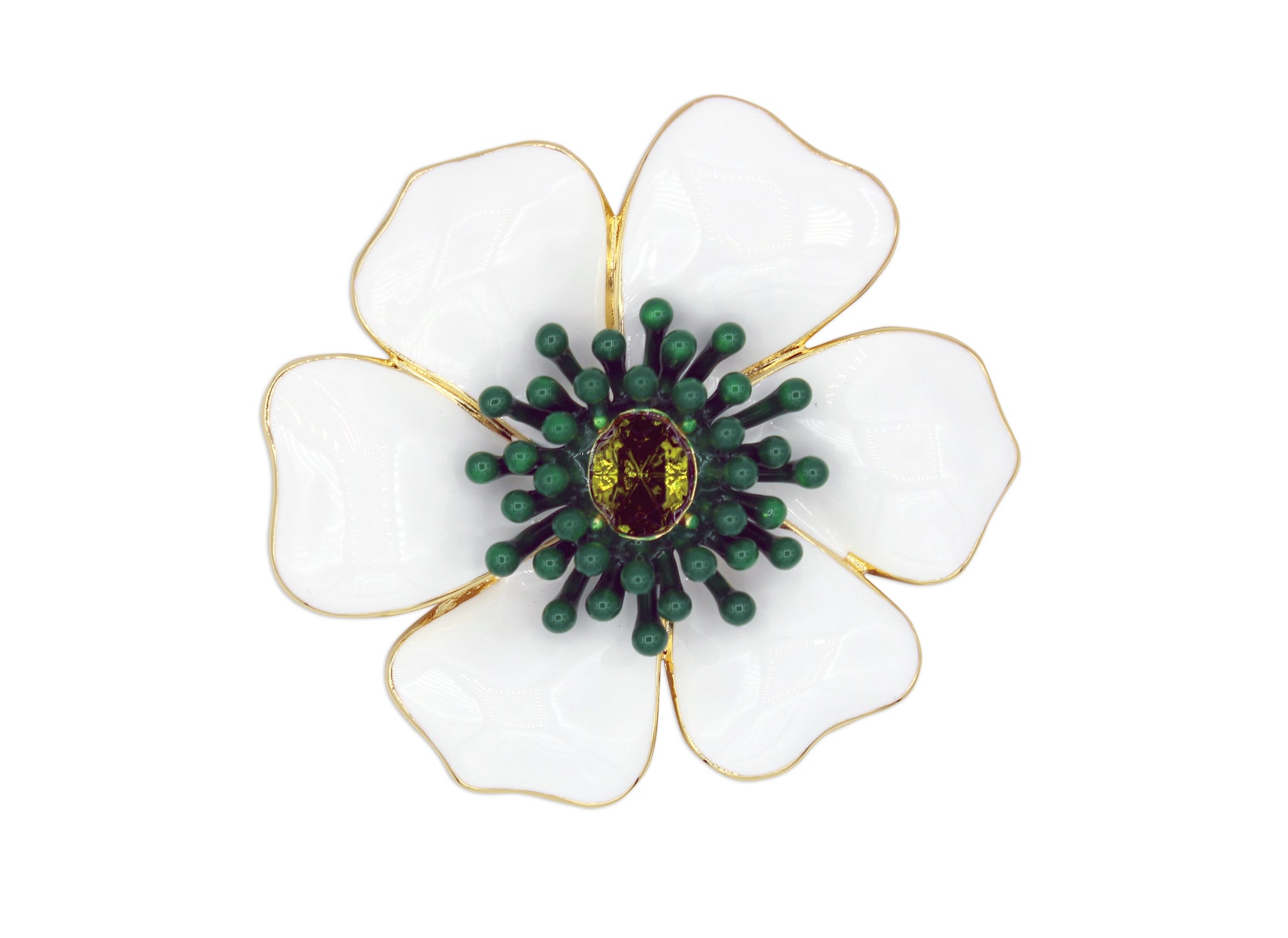 Daisy represents purity and cheerfulness.  Our unique brooch handcrafted in enamel and in crystal.